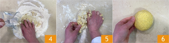 Despeje gradualmente a água morna em fio enquanto sovar com as mãos 4, depois continue trabalhando por cerca de dez minutos 5 até obter uma massa lisa, elástica e homogênea 6. Envolva em filme plástico e deixe descansar por 30 minutos em um local fresco e seco.