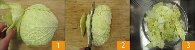 Para preparar o repolho gratinado ao forno, primeiro remova as folhas mais externas do repolho 1, depois corte em fatias de cerca de 2 cm de largura 2. Enxágue bem o repolho em água corrente 3.