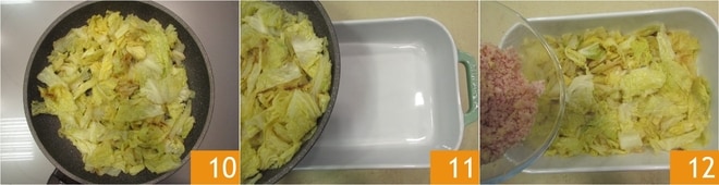 Quando o repolho estiver murcho 10, despeje quase tudo em uma travessa de 20x31 cm, cuidando para cobrir todo o fundo 11. Cubra com a mistura de presunto e queijo 12.