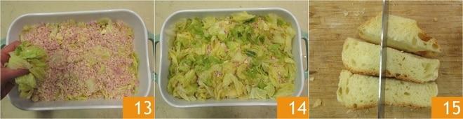 Adicione o restante do repolho 13 e asse em forno estático pré-aquecido a 200°C por 15 minutos 14. Enquanto isso, corte o pão em pedaços 15.