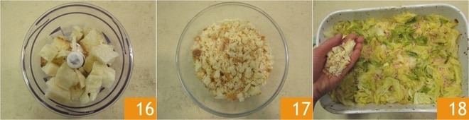 Transfira o pão para um mixer junto com o Parmigiano Reggiano DOP em pedaços 16 e triture grosseiramente 17. Após o tempo de cozimento, retire a assadeira e distribua a mistura de pão e Parmigiano Reggiano DOP na superfície 18.