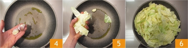 Doure os dentes de alho com casca em uma frigideira grande com um fio de óleo 4, depois adicione o repolho 5. Cozinhe em fogo médio-alto por 15 minutos com a adição de meio copo de água para que fique ligeiramente ensopado, mexendo frequentemente 6.