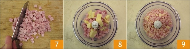 Enquanto isso, corte o presunto em cubos 7 e coloque em um mixer junto com o queijo emmenthal 8, depois triture até ficar bem picado 9.