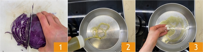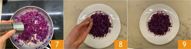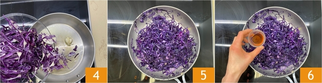 Adicione o repolho roxo 4 e salteie em fogo médio-alto por 5 minutos 5. Uma vez amolecido, desligue o fogo e deixe esfriar um pouco, depois regue com o vinagre de vinho tinto 6.
