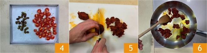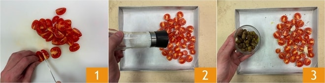 Para preparar os rigatoni à puttanesca e nduja, lave e corte os tomatinhos em pedaços 1. Coloque metade deles em uma assadeira forrada com papel manteiga e asse no forno a 180° com sal, pimenta e azeite até começarem a caramelizar 2. Após 15 minutos, adicione metade das azeitonas taggiasche e continue assando por mais 15 minutos 3.