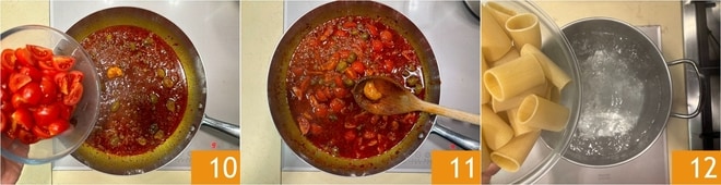 Junte o restante dos tomatinhos crus 10 e deixe cozinhar por cerca de 15 minutos; ao final da cocção, retire o dente de alho 11. Enquanto isso, cozinhe os rigatoni em abundante água salgada 12.
