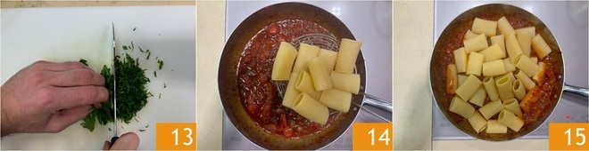 Pique finamente a salsinha 13. Alguns minutos antes do término da cocção, escorra a massa no molho 14, misture para absorver o sabor e complete a cocção; se necessário, adicione uma concha de água quente.