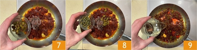 Quando começar a caramelizar no fundo, adicione as anchovas, as azeitonas restantes 7 e as alcaparras (previamente dessalgadas) 8. Cozinhe por cerca de 5 minutos, depois adicione o vinho branco 9.