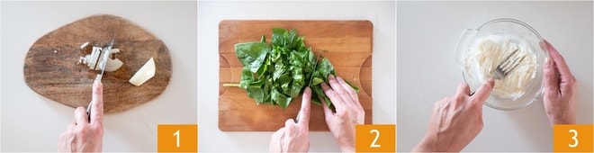 Para preparar os rigatoni com espinafre, linguiça e robiola, a primeira coisa a fazer é descascar e picar finamente a cebola 1. Pique grosseiramente também o espinafre, bem lavado 2. Agora transfira a robiola para uma tigela, trabalhe-a com um garfo 3 para amolecê-la e guarde na geladeira.