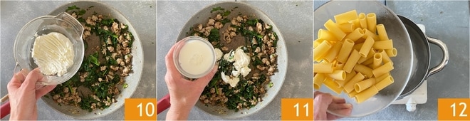Quando o espinafre estiver murcho, adicione também a robiola 10 e o leite 11, que ajudará a derreter o queijo. Adicione-o aos poucos até obter a cremosidade certa. Enquanto isso, cozinhe a massa em bastante água fervente salgada 12.