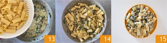 Escorra a massa al dente, transfira-a para a frigideira com o molho 13 e salteie por alguns instantes 14. Os rigatoni com espinafre, linguiça e robiola estão prontos para servir 15!