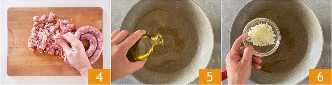 Continue com a linguiça: retire-a da tripa e esfarele com as mãos 4. Aqueça um fio de azeite em uma frigideira grande 5, adicione a cebola 6 e deixe dourar.