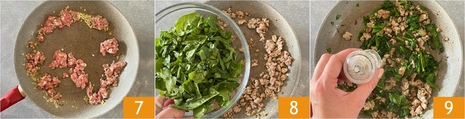 Adicione a linguiça esfarelada 7 e misture até que esteja bem dourada. Por fim, acrescente também o espinafre 8 e tempere com uma pitada de sal 9.