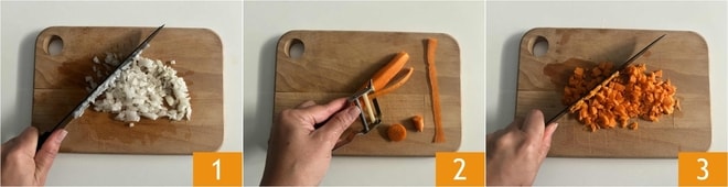 Para preparar o arroz com lentilhas, a primeira coisa a fazer é preparar o Caldo de legumes e mantê-lo quente, depois passe à preparação das lentilhas, que devem ser cozidas separadamente antes de serem adicionadas ao arroz. Primeiro, descasque e pique finamente a cebola 1. Elimine as extremidades da cenoura e descasque-a 2, depois pique-a grosseiramente 3.