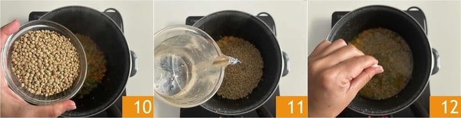 Em seguida, adicione as lentilhas 10, a água 11 e o sal 12. As lentilhas não precisam ficar de molho, mas podem ser lavadas antes.