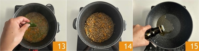 Adicione então a folha de louro 13, misture bem tudo e cozinhe as lentilhas em fogo baixo por cerca de 30 minutos 14. Quando as lentilhas estiverem prontas, você pode começar a preparar o arroz. Despeje um fio de azeite extravirgem em uma panela e aqueça-a 15.