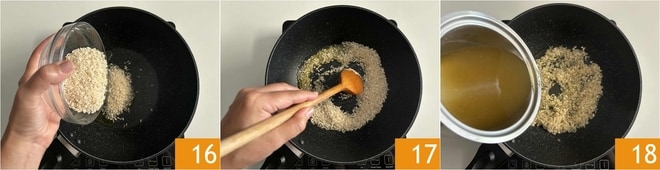 Neste ponto, adicione o arroz 16 e toste-o por alguns instantes, mexendo com uma colher de pau 17. Em seguida, adicione uma concha de caldo de legumes 18.