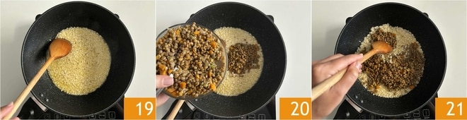 Continue cozinhando e adicione o caldo aos poucos, conforme necessário 19. Na metade do cozimento, adicione as lentilhas 20 e misture bem tudo 21.