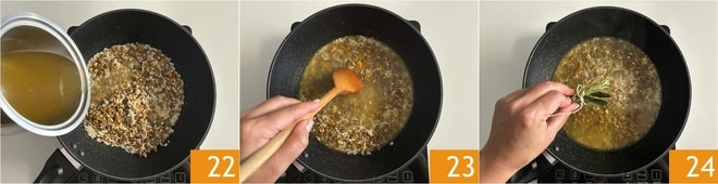 Adicione mais caldo 22, continue mexendo 23 e adicione um maço de ervas amarradas com barbante, nós usamos uma folha de sálvia, uma de louro e um ramo de alecrim 24.