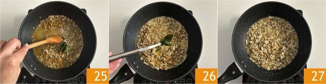 Continue o cozimento, sempre adicionando o caldo conforme necessário 25. Ao final do cozimento, retire as ervas aromáticas 26 e desligue o fogo 27.