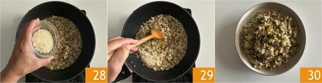 Por fim, adicione o queijo parmesão ralado 28 e misture tudo 29. O arroz com lentilhas está pronto, agora é só levar à mesa 30.