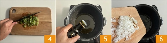 Resta preparar o aipo, que também deve ser picado à faca 4. Despeje um fio de azeite extravirgem em uma panela 5, adicione a cebola 6.