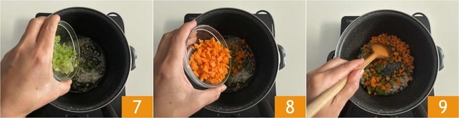 Em seguida, adicione o aipo 7, a cenoura 8 e refogue por alguns minutos em fogo baixo 9.