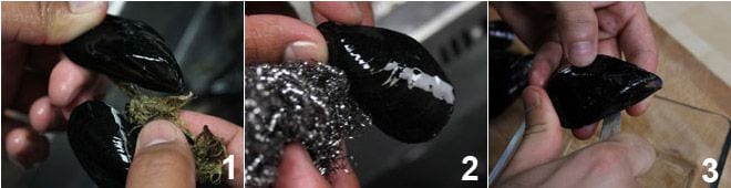 Para preparar o arroz, batatas e mexilhões, comece limpando os mexilhões: retire o bisso de cada mexilhão 1 e elimine as eventuais impurezas na casca ajudando-se com uma lã de aço 2. Para ver em detalhe a limpeza dos mexilhões, Como limpar e abrir mexilhões. Com uma faquinha, abra-os, começando pela ponta e fazendo um giro seguindo a borda da casca do mexilhão 3, tendo cuidado de recolher em um recipiente o líquido que escorre.