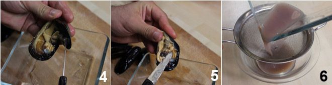 Transfira o molusco da valva superior para a inferior e retire a valva vazia (4-5). Filtre o líquido escorrido com uma peneira de malha fina e reserve 6.