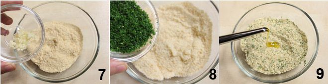 Prepare agora a farofa: pique finamente o alho e adicione ao pão ralado 7; depois pique a salsa e adicione metade ao pão ralado 8. Misture e adicione o azeite de oliva extravirgem 9.