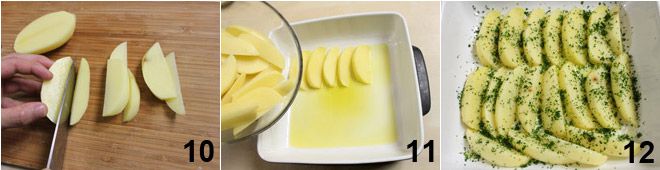 Descasque as batatas e corte-as em pedaços 10. Pegue uma assadeira quadrada de 23 cm e cubra o fundo com azeite de oliva extravirgem, disponha as batatas 11, salgue e apimente e adicione uma pitada de salsa 12.