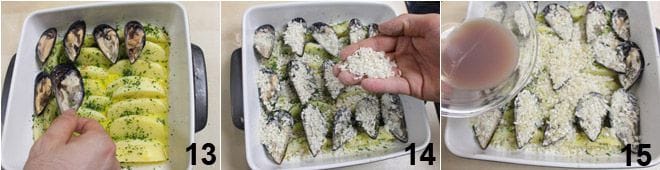 Continue com uma camada de mexilhões 13, polvilhe com o parmesão e continue adicionando o arroz cru 14. Adicione agora o líquido dos mexilhões que reservou 15, garantindo-se de derramar delicadamente por toda a assadeira.