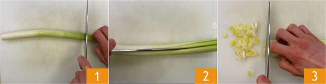 Para preparar os risonis com alho-poró, robiola e avelãs, a primeira coisa a fazer é cuidar dos alhos-porós. Elimine as raízes e as partes verdes 1, com estas últimas você pode preparar um caldo de legumes. Corte os alhos-porós ao meio 2 e depois em rodelas bem finas 3.