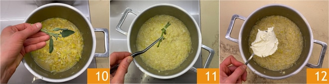Adicione a sálvia 10 e cozinhe. Remova a sálvia 11 e, fora do fogo, adicione a robiola 12.