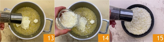 Adicione pimenta 13, o parmesão ralado 14 e misture bem. Sirva e tempere com mais uma pitada de pimenta 15.