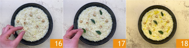 Complete com as avelãs 16, algumas folhas de sálvia fritas 17 e um fio de azeite cru. Os risonis com alho-poró, robiola e avelãs estão prontos para serem degustados 18!