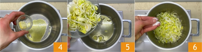 Em uma panela, coloque o óleo e adicione uma noz de manteiga 4 e os alhos-porós 5. Tempere com sal 6 e refogue por pelo menos 5 minutos.