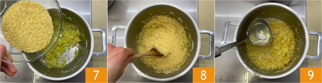 Quando os alhos-porós estiverem macios, adicione os risonis 7, dê uma mexida 8 para tostar rapidamente, então regue com caldo de legumes 9 até cobrir.