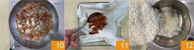 Deixe o guanciale suar em fogo baixo por cerca de 10 minutos 10. Quando estiver crocante e dourado, retire-o da frigideira e transfira para papel absorvente 11. Agora coloque o arroz em uma panela 12 e torre-o a seco, mexendo com frequência.