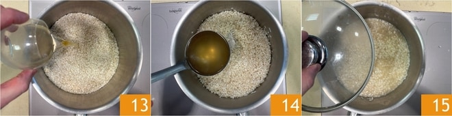 Regue com o vinho branco 13 e deixe a parte alcoólica evaporar completamente. Em seguida, cozinhe o arroz adicionando uma concha de caldo quente de cada vez, certificando-se sempre de que o líquido seja absorvido antes de adicionar a próxima 14. A três quartos do tempo de cozimento indicado, desligue o fogo, cubra com a tampa 15 e deixe descansar por 3 minutos.