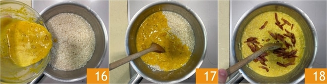 Após esse tempo, adicione a mistura de ovos e pecorino 16 e misture bem 17, depois adicione cerca de metade do guanciale dourado e misture novamente 18.