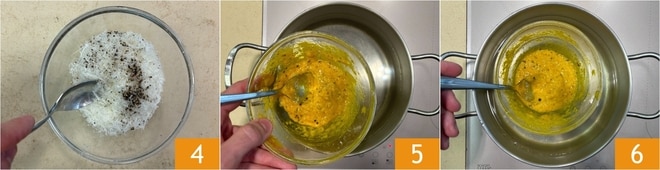 Misture bem 4, depois coloque a tigela sobre uma panela em banho-maria 5 e continue mexendo em fogo médio-baixo até que a mistura fique cremosa 6.
