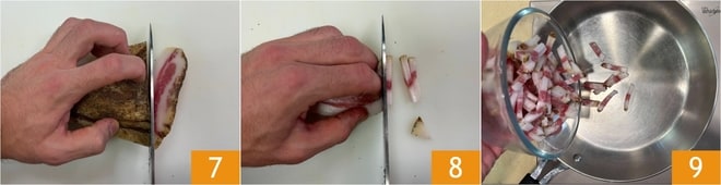 Deixe de lado e cuide do guanciale: depois de retirar a pele, corte-o primeiro em fatias 7 e depois em tiras 8. Coloque o guanciale em uma frigideira já quente 9.