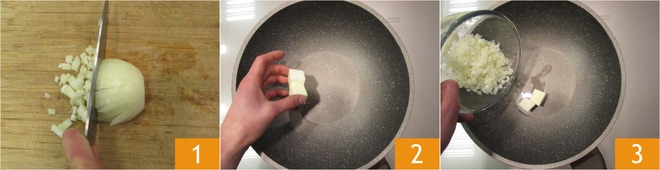 Para preparar o risoto à milanesa sem tutano, você precisará de cerca de 1 litro de Caldo de carne clássico, que deve ser mantido sempre muito quente. Descasque e pique finamente meia cebola branca 1. Em uma panela grande, adicione 25 g de manteiga 2, depois a cebola picada 3. Deixe murchar em fogo médio, mexendo de vez em quando para amolecer.
