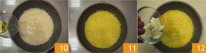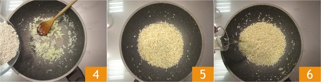 Uma vez dourada, adicione o arroz Carnaroli 4: o arroz absorverá a manteiga e se misturará com a cebola. Quando estiver tostado e translúcido 5, você poderá adicionar o vinho branco 6. Deixe evaporar o álcool por alguns instantes.
