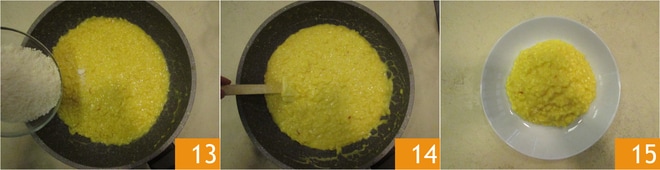 Adicione também o Parmigiano Reggiano DOP ralado 13, mexa vigorosamente 14, para que a manteiga e o queijo bem frios criem o choque térmico que favorecerá a cremosidade e o brilho do risoto. Sirva o risoto à milanesa sem tutano bem quente 15!