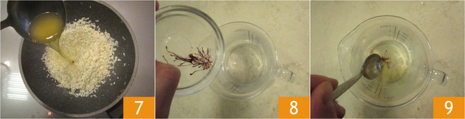 Adicione o caldo muito quente, até cobrir, e continue o cozimento em fogo alto, adicionando caldo quente conforme necessário 7. Mergulhe delicadamente os pistilos em água quente 8, mexa ligeiramente para reidratá-los 9.