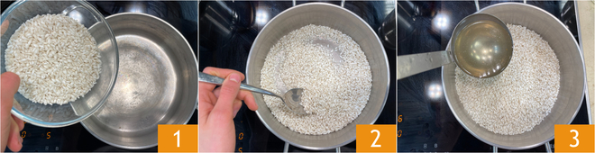 Para preparar o risoto amarelo com laranja, primeiro faça o Caldo de legumes seguindo nossa receita e mantenha-o aquecido. Coloque o arroz em uma panela grande 1 e toste-o a seco, mexendo frequentemente 2. Quando o arroz ficar translúcido, comece a regá-lo com uma concha de caldo por vez, sempre esperando que o líquido seja absorvido antes de adicionar mais 3.