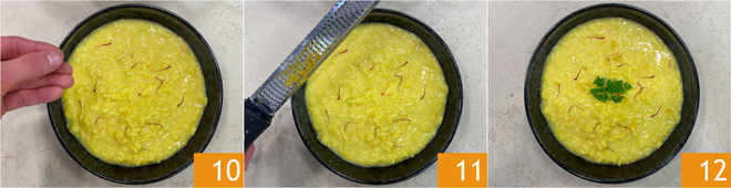 Decore o risoto com os pistilos reservados 10 e finalmente aromatize com a casca de laranja ralada 11. Complete com uma folhinha de cerefólio e sirva imediatamente o seu risoto amarelo com laranja 12!