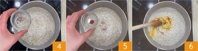 Após cerca de 6 minutos, tempere com o açafrão em pistilos 4 e em pó 5, tendo o cuidado de reservar alguns pistilos para a montagem do prato. Mexa delicadamente 6 e continue cozinhando por um total de cerca de 14 minutos.
